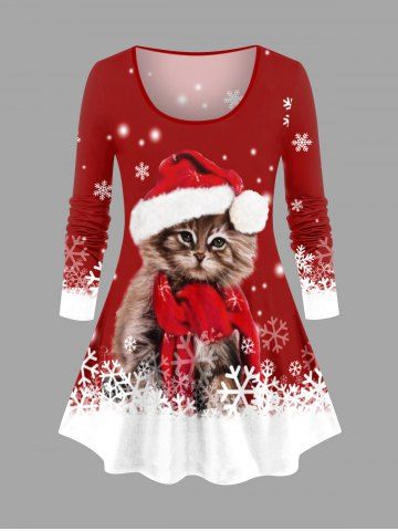 Plus Size Christmas Hat Cat Snowflake Colorblock Print T-shirt - Red - S