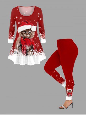 Plus Size Christmas Hat Cat Snowflake Colorblock Print T-shirt - Red - 4x