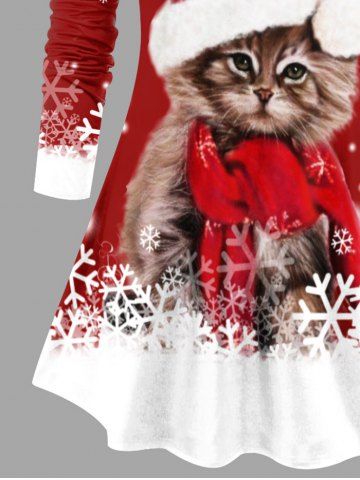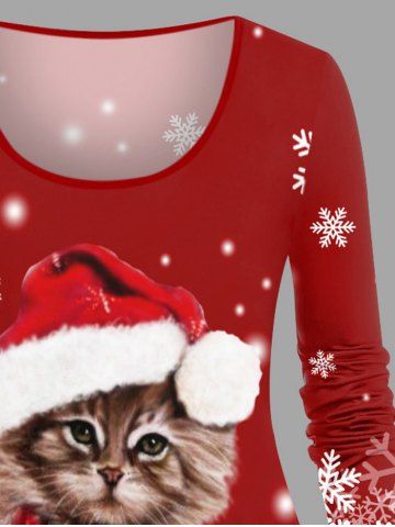 Plus Size Christmas Hat Cat Snowflake Colorblock Print T-shirt - Red - 6x