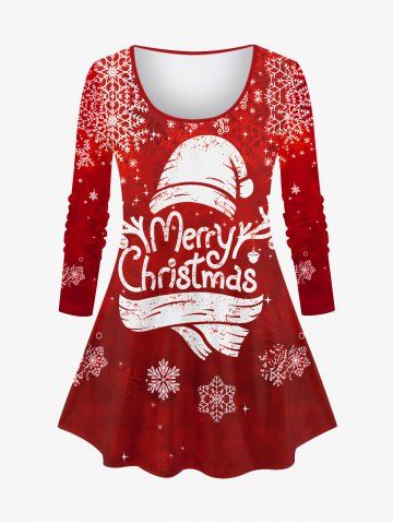 Plus Size Christmas Hat Elk Horn Snowflake Letters Print Long Sleeve T-shirt - Deep Red - M