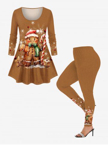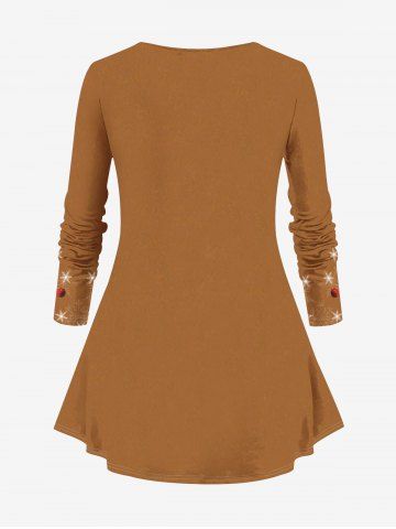 Plus Size Christmas Hat Galaxy Gingerbread Candy Ball Print Long Sleeves T-shirt - Coffee - 2x