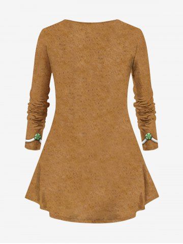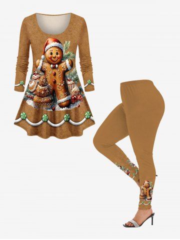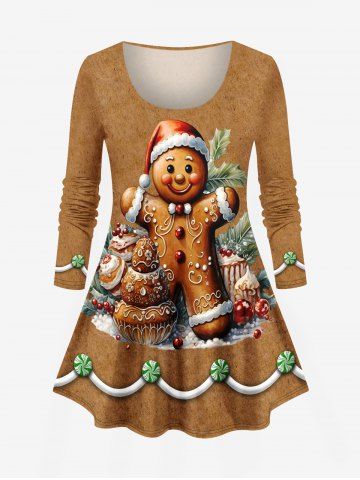 Plus Size Christmas Hat Gingerbread Candy Holy Fruit Leaf Print T-shirt - Coffee - M