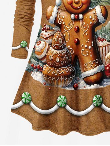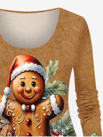 Plus Size Christmas Hat Gingerbread Candy Holy Fruit Leaf Print T-shirt - Coffee - 3x