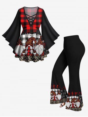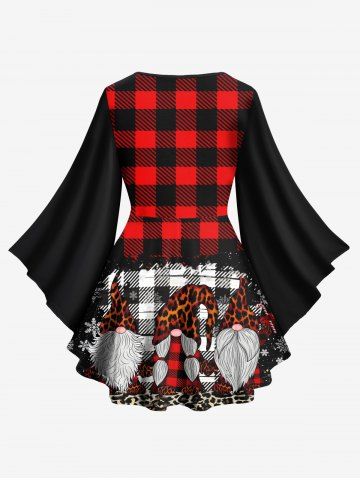 Plus Size Christmas Hat Santa Claus Leopard Plaid Print Flare Sleeves Lattice T-shirt - Black - 5x
