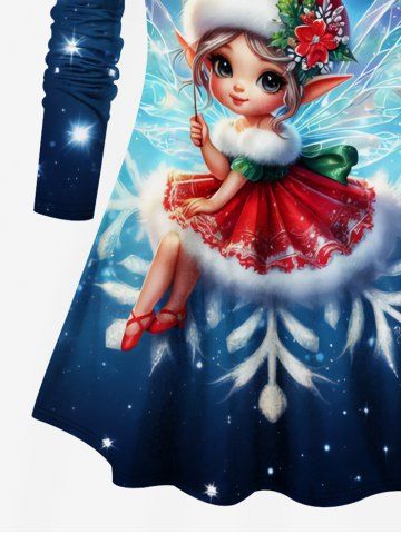 Plus Size Christmas Hat Snowflake Elf Glitter Ombre Galaxy Print Long Sleeves T-shirt - Deep Blue - 3x