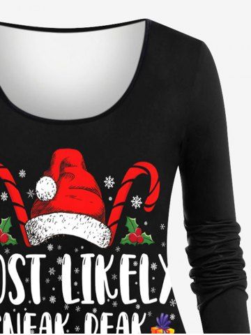 Plus Size Christmas Hat Snowflake Light Candy Letters Print Long Sleeves T-shirt - Black - L