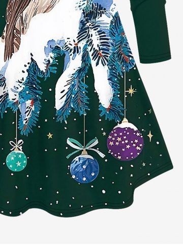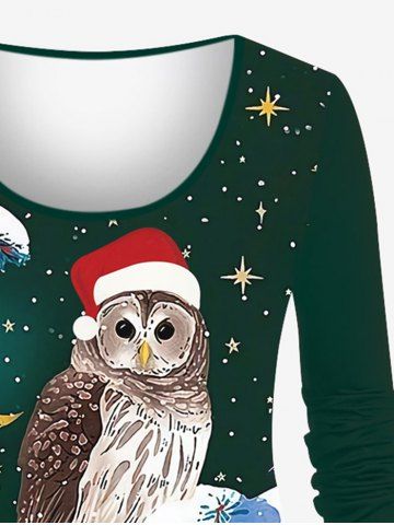 Plus Size Christmas Hat Tree Ball Snow Moon Stars Galaxy Owl Leaf Print Long Sleeves T-shirt - Deep Green - M
