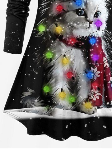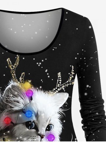 Plus Size Christmas Light Elk Cat Galaxy Print Long Sleeves T-shirt - Black - L