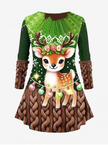 Tops > Plus Size Christmas Light Elk Flowers Snowflake Cable Knit 3D Print Long Sleeves T-shirt