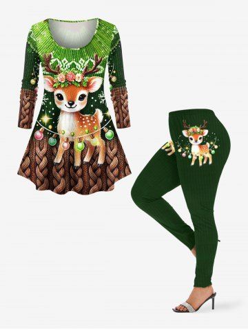 Plus Size Christmas Light Elk Flowers Snowflake Cable Knit 3D Print Long Sleeves T-shirt - Green - 5x