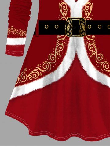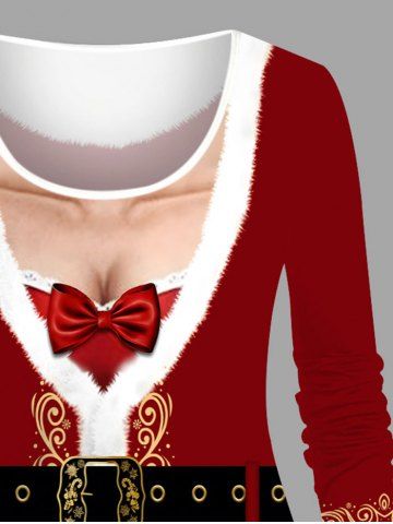 Plus Size Christmas Santa Claus Bowknot Floral Trim Belt 3D Print T-shirt - Red - 2x