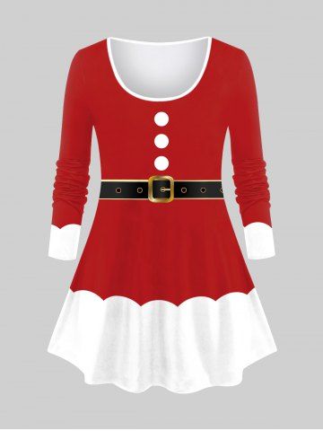 Plus Size Christmas Santa Claus's Colorblock Buttons Buckle Belt 3D Print T-shirt - Red - Xs