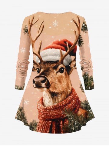 Plus Size Christmas Snowflake Elk Hat Print Long Sleeves Women T-shirt - Light Orange - Xs