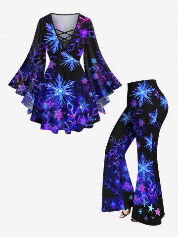 Plus Size Christmas Snowflake Galaxy Print Lattice Crisscross Flare Sleeves T-shirt - Navy Blue - M