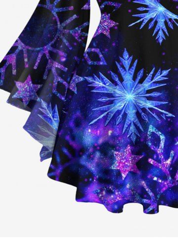 Plus Size Christmas Snowflake Galaxy Print Lattice Crisscross Flare Sleeves T-shirt - Navy Blue - 3x