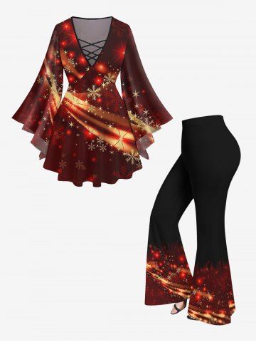Plus Size Christmas Snowflake Light Beam Glitter 3D Print Lattice Crisscross Flare Sleeve T-shirt - Black - M