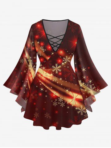 Tops > Plus Size Christmas Snowflake Light Beam Glitter 3D Print Lattice Crisscross Flare Sleeve T-shirt