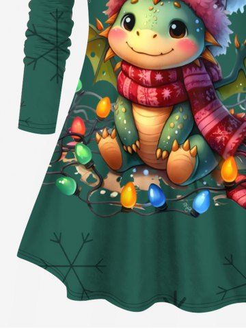 Plus Size Christmas Snowflake Light Cute Dinosaur Print Long Sleeves T-shirt - Green - S