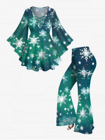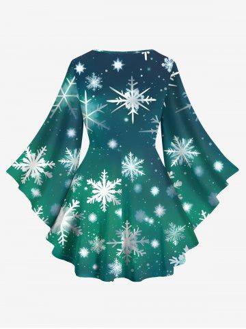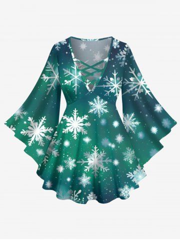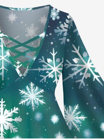 Plus Size Christmas Snowflake Ombre Galaxy Print Lattice Long Sleeves T-shirt - Green - 1x