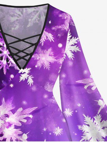 Plus Size Christmas Snowflake Ombre Glitter 3D Print Flare Sleeve Lattice Crisscross T-shirt - Purple - 1x