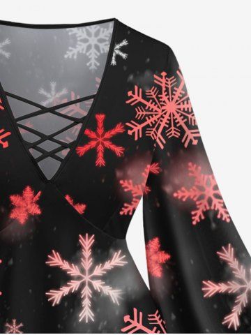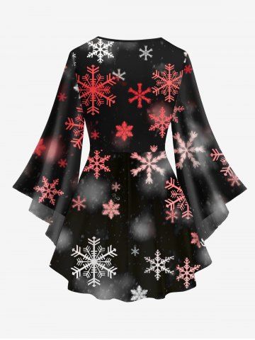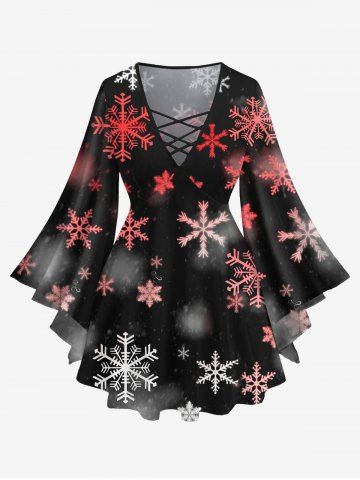 Plus Size Christmas Snowflake Ombre Print Lattice Crisscross Flare Sleeve T-shirt - Black - 5x