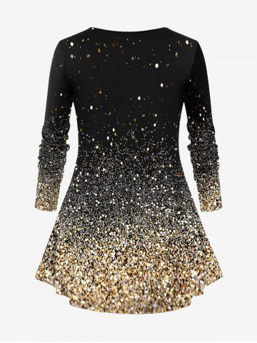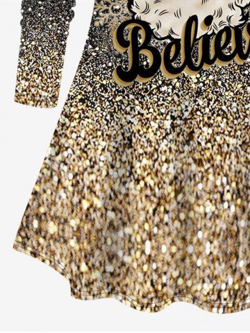 Plus Size Christmas Snowflake Santa Clause Sparkling Sequin Glitter 3D Print Long Sleeve T-shirt - Golden - L