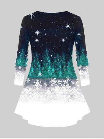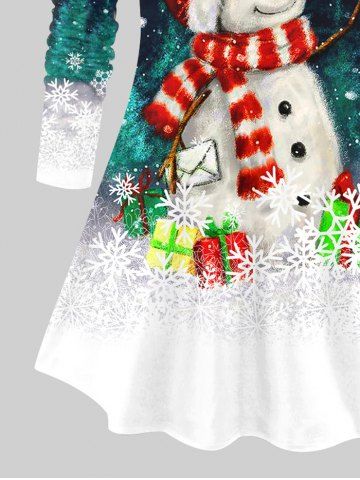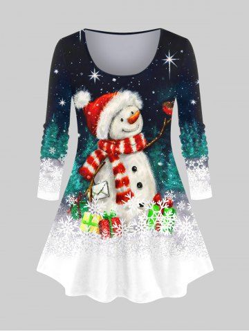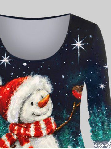 Plus Size Christmas Snowman Snowflake Glitter Bird Colorblock Print T-shirt - Deep Green - 3x