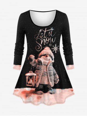 Plus Size Christmas Snowman Snowflake Light Glitter 3D Print Long Sleeve T-shirt - Black - 2x