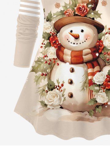 Plus Size Christmas Snowman Snowflake Rose Flowers Striped Checkered Plaid Colorblock Print Raglan Sleeve T-shirt - Light Coffee - 1x