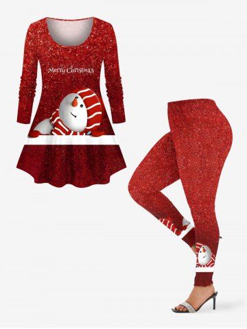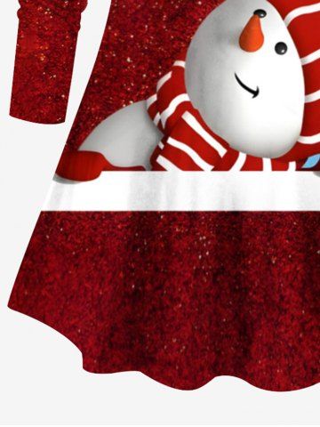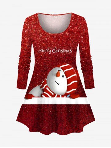 Plus Size Christmas Snowman Sparkling Sequin 3D Print Long Sleeves T-shirt - Red - Xs