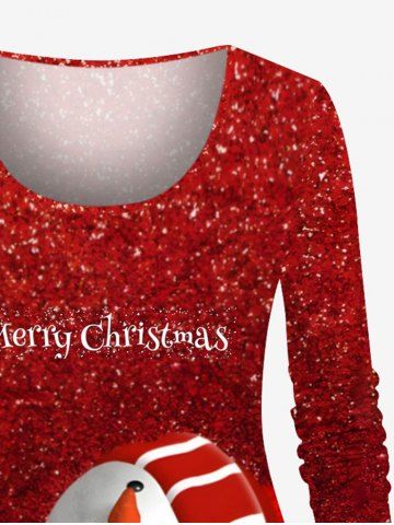 Plus Size Christmas Snowman Sparkling Sequin 3D Print Long Sleeves T-shirt - Red - 4x