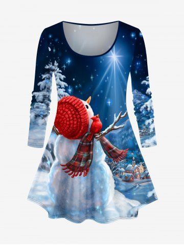 Plus Size Christmas Snowman Star Tree House Snow Print T-shirt - Blue - L