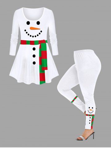 Plus Size Christmas Snowman Striped Scarf Print T-shirt - White - 1x