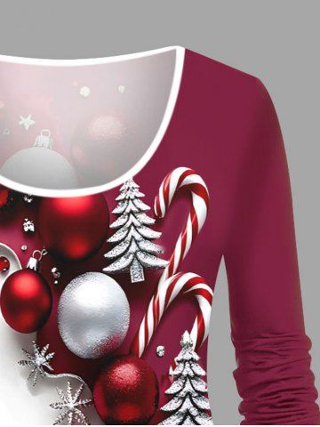 Plus Size Christmas Tree Ball Candy Colorblock Print Long Sleeves T-shirt - Red - 4x