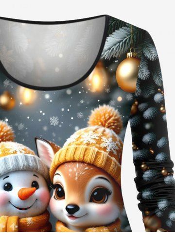 Plus Size Christmas Tree Ball Gift Snowman Elk Print Long Sleeves Women T-shirt - Black - S