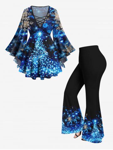 Plus Size Christmas Tree Ball Snowflake Glitter Light Beam 3D Print Lattice Crisscross Flare Sleeve T-shirt - Multi-a - S