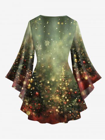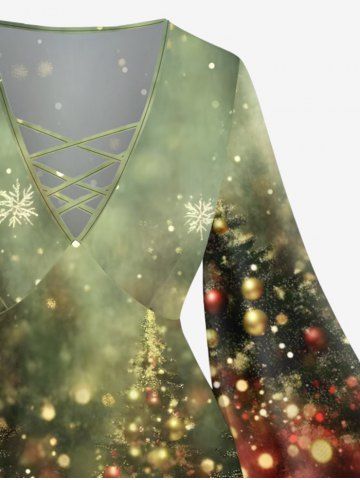 Plus Size Christmas Tree Ball Snowflake Light Glitter 3D Print Flare Sleeve Lattice Crisscross T-shirt - Green - 1x