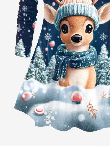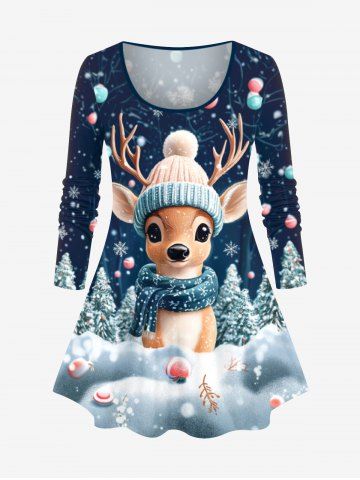 Plus Size Christmas Tree Elk Ball Snowflake Print Long Sleeves T-shirt - Blue - S