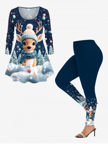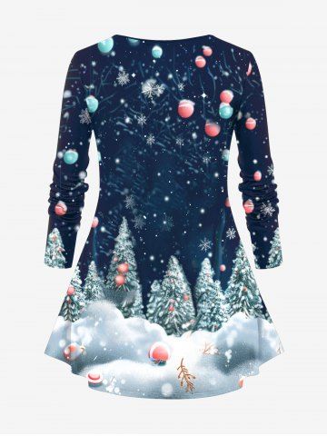Plus Size Christmas Tree Elk Ball Snowflake Print Long Sleeves T-shirt - Blue - 1x