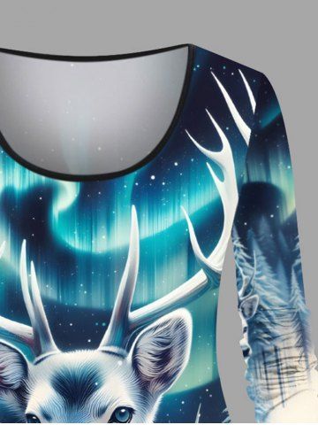 Plus Size Christmas Tree Elk Galaxy Glitter 3D Print Long Sleeves T-shirt - Blue - 1x
