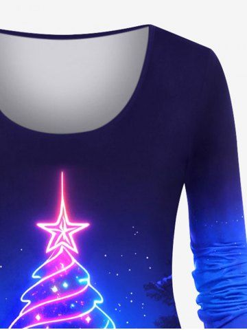 Plus Size Christmas Tree Elk Light Glitter 3D Print Long Sleeve T-shirt - Sky Blue - S