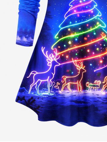 Plus Size Christmas Tree Elk Light Glitter 3D Print Long Sleeve T-shirt - Sky Blue - M