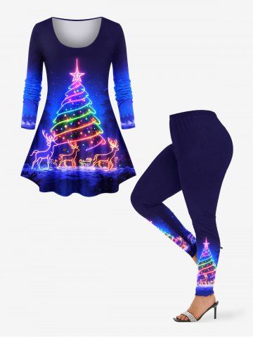 Plus Size Christmas Tree Elk Light Glitter 3D Print Long Sleeve T-shirt - Sky Blue - L