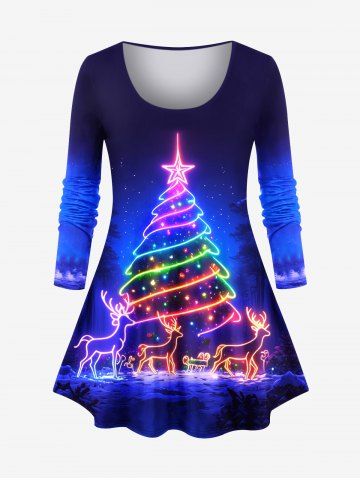 Plus Size Christmas Tree Elk Light Glitter 3D Print Long Sleeve T-shirt - Sky Blue - 6x