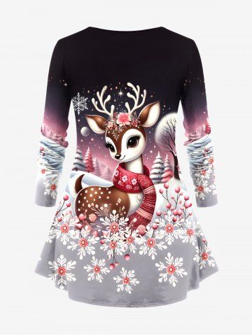 Plus Size Christmas Tree Elk Snowflake Flowers Print Long Sleeves T-shirt - Black - 4x