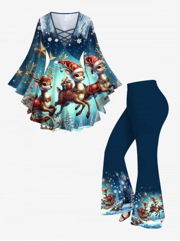 Plus Size Christmas Tree Elk Snowflake Ombre Print Lattice Long Sleeves T-shirt - Sky Blue - L