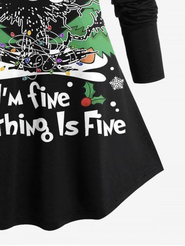 Plus Size Christmas Tree Hat Cat Letters Print Long Sleeves T-shirt - Black - 3x