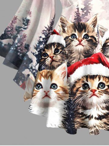 Plus Size Christmas Tree Hat Cat Print Lattice Long Sleeves Women T-shirt - White - L