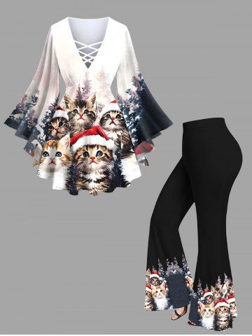 Plus Size Christmas Tree Hat Cat Print Lattice Long Sleeves Women T-shirt - White - 2x