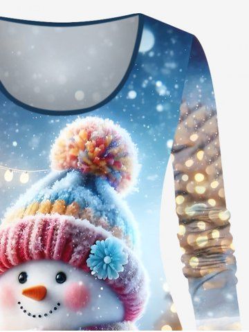 Plus Size Christmas Tree Light Gloves Hat Snowman Snowflake Print T-shirt - Blue - L